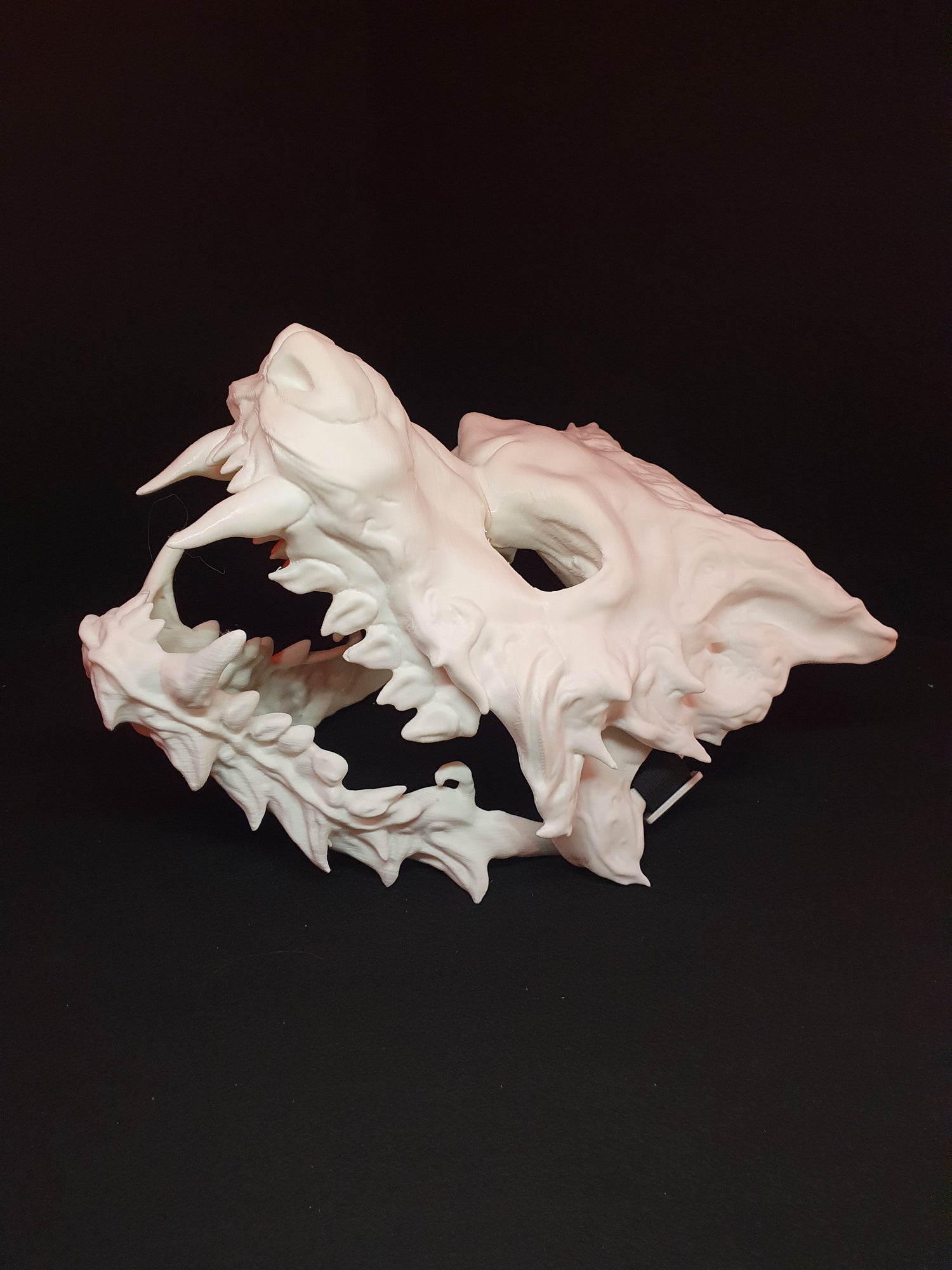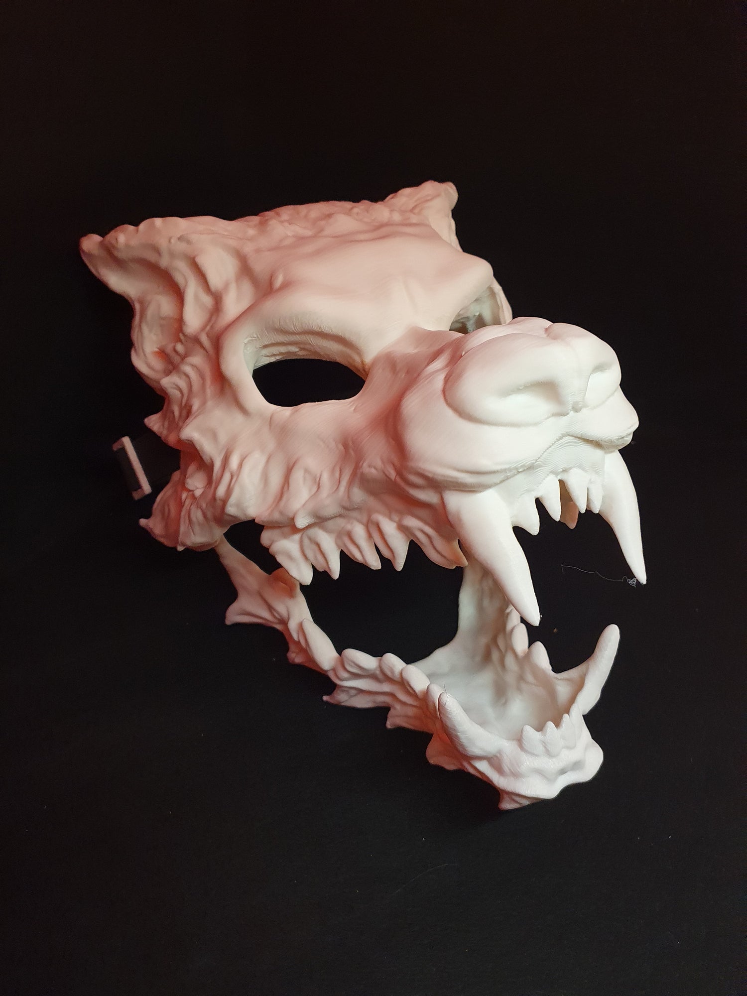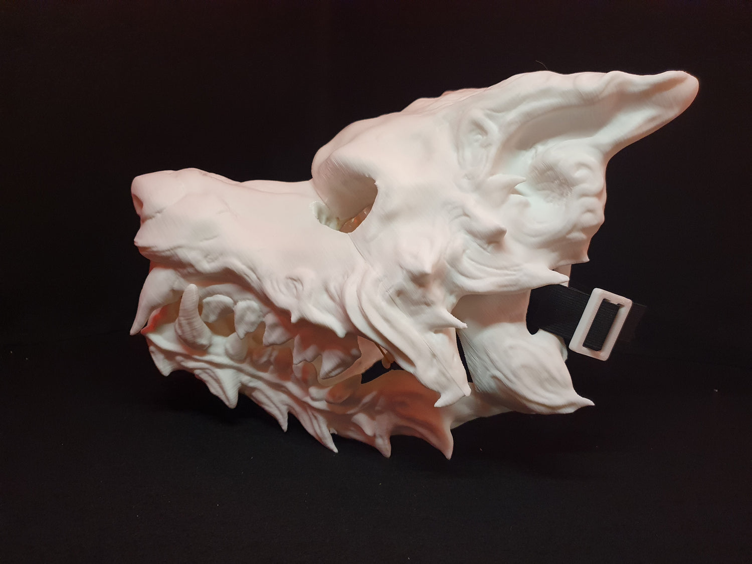 The mask is printed in PLA and is supplied with a simple elastic band. It is an excellent base mask to create your own custom mask with some post-processing, or you can use it as-is. It fits an average adult face, but please contact me if you are worried about the sizing. The standard size fits a 23inch/58cm head size.